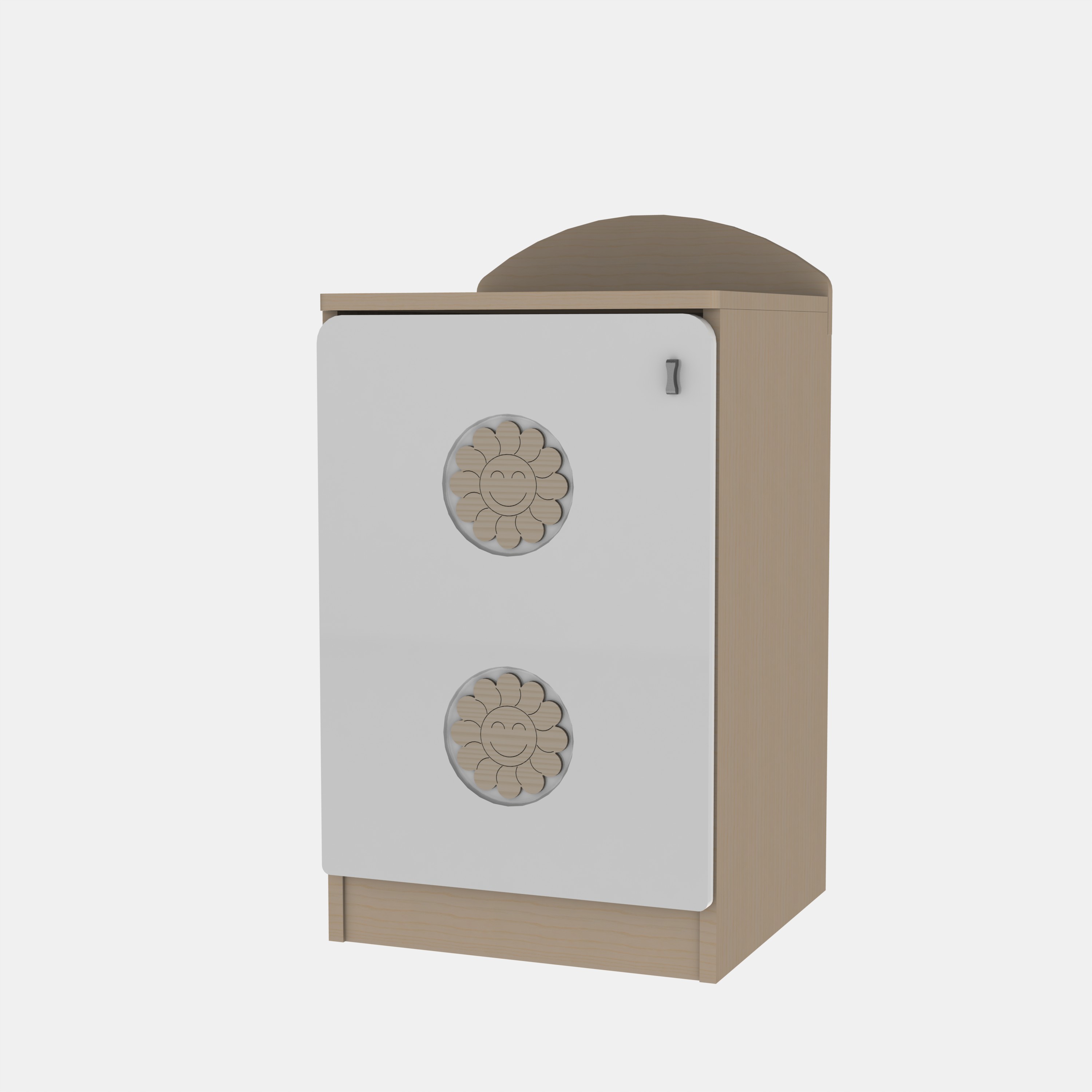 Korpus wykonany z płyty meblowej, fronty foliowane i ozdobione lakierowanymi słonecznikami wykonanymi ze sklejki.
